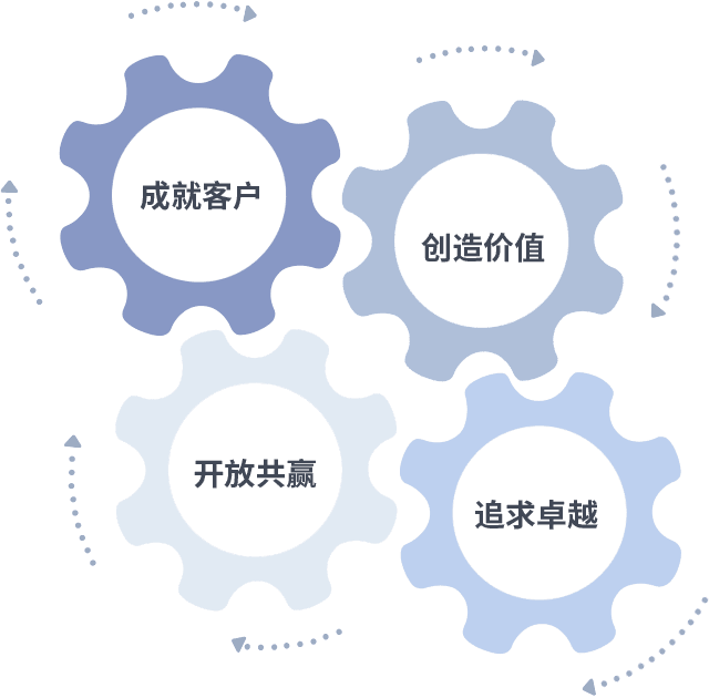 成就客户是一切决策的出发点,,,,创造价值是衡量所有工作的标准,,,追求卓越是88858cc永利做事做人的态度,,,,开放共赢是88858cc永利的格局也是最终的结果。。。。价值观的齿轮环环相扣,,推动着组织里的每个人不断向前。。